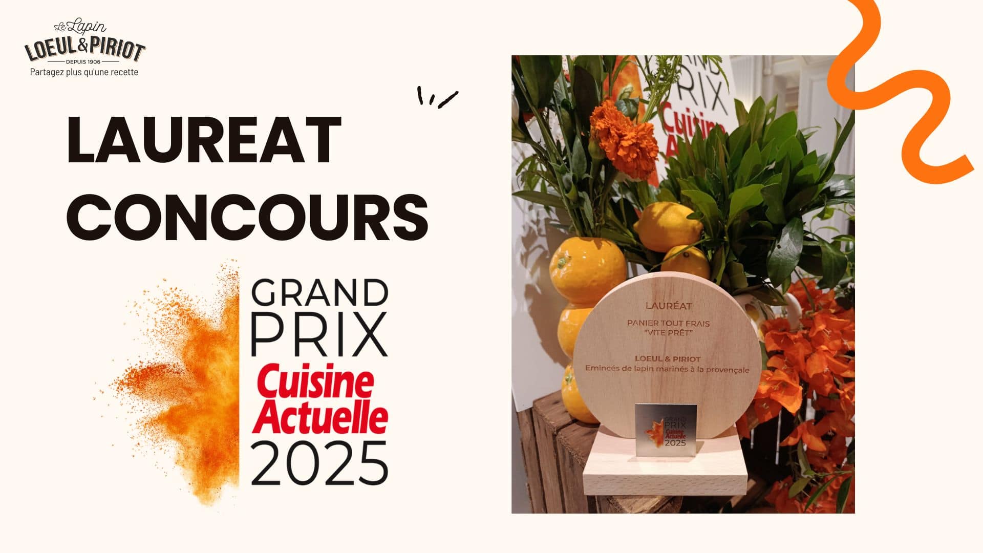 > Lire la suiteUne belle reconnaissance pour LOEUL & PIRIOT ! Nous sommes fiers d’annoncer qu'aujourd'hui notre référence « Émincés de lapin marinés à la provençale » a reçu un prix, dans le cadre de notre participation au Grand Prix Cuisine Actuelle 2025, dans la catégorie « Vite prêt » du panier « Tout frais » ! Un grand merci à toute l’équipe de Cuisine Actuelle pour l’organisation du concours, et de cette magnifique cérémonie de remise des prix au George V, à Paris. Mais aussi et surtout aux testeurs et consommateurs qui ont plébiscité notre produi...